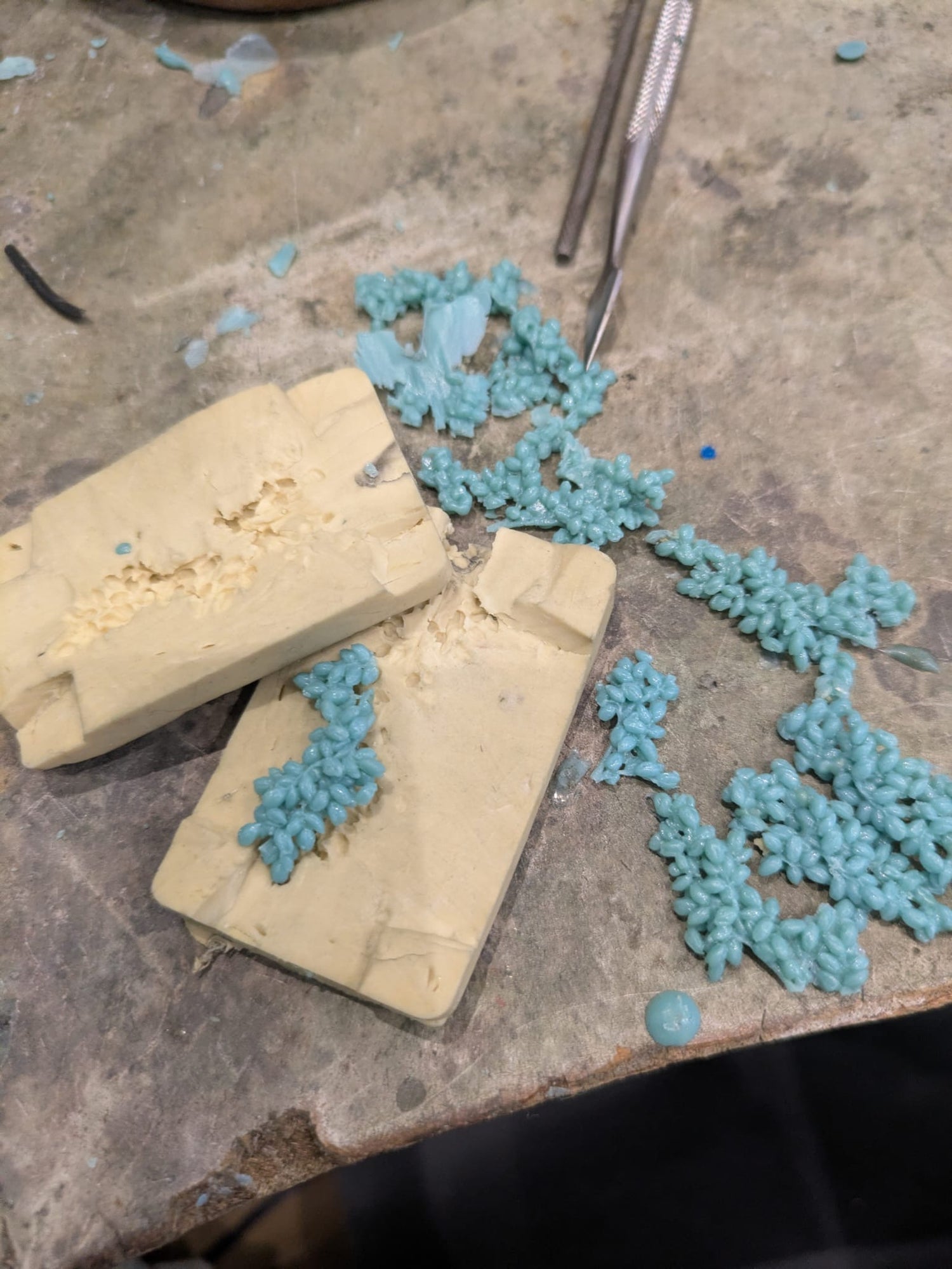 Ein besonders schwieriger Teil des Verfahrens besteht darin, die Pflanze mit all ihren Details in einer Form zu konservieren. Die Pflanze wird in das Wachs gepresst, und anschließend wird davon eine Form hergestellt.