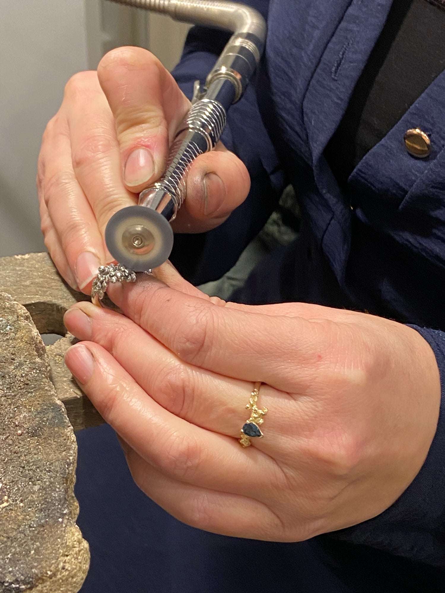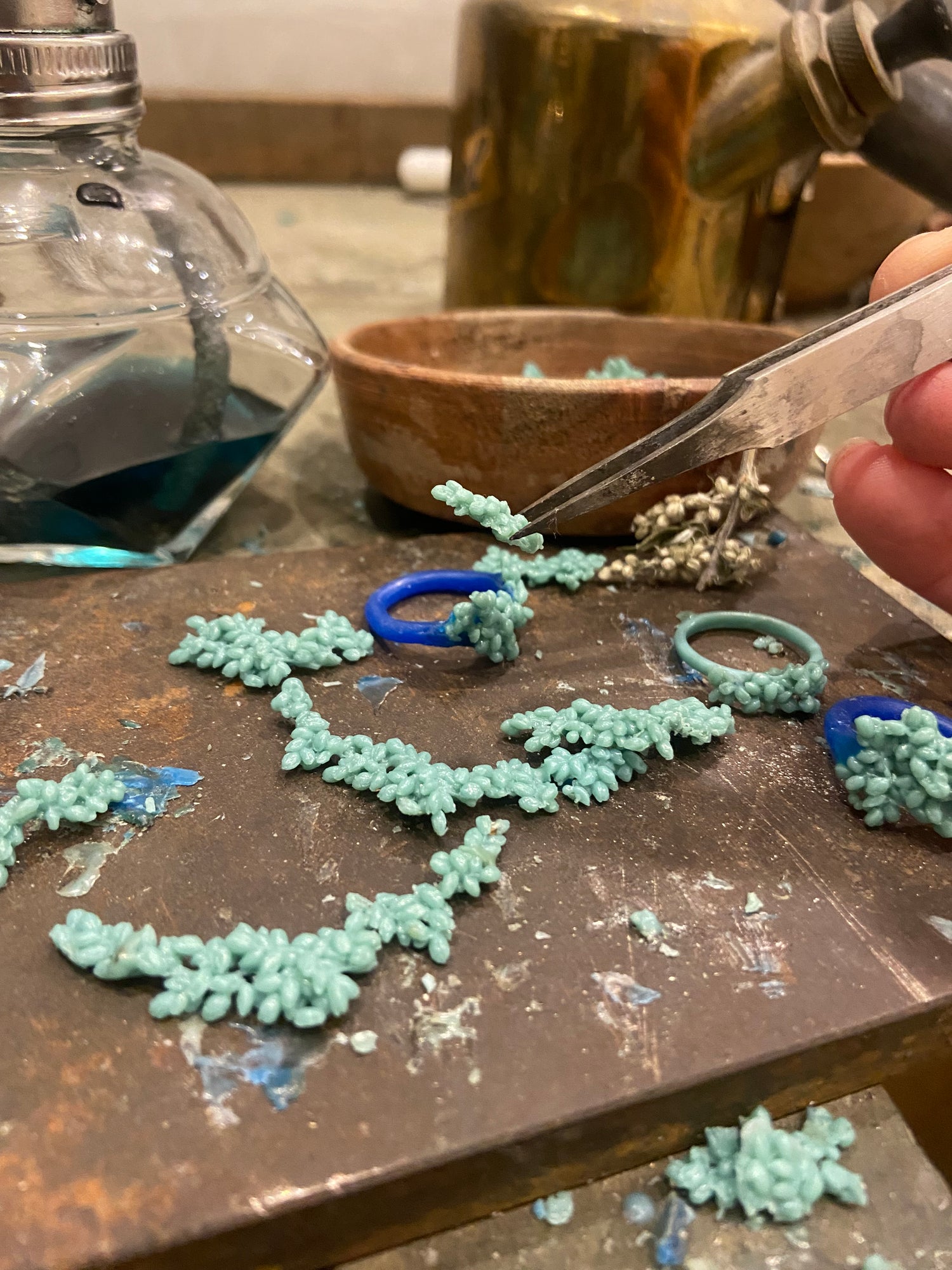 Die Wachsmodelle werden in Silber oder Gold gegossen und anschließend bearbeitet. Jasca entscheidet dann, was sie mit den Stücken macht, beispielsweise einen Stein hinzufügt oder einen Bereich öffnet.