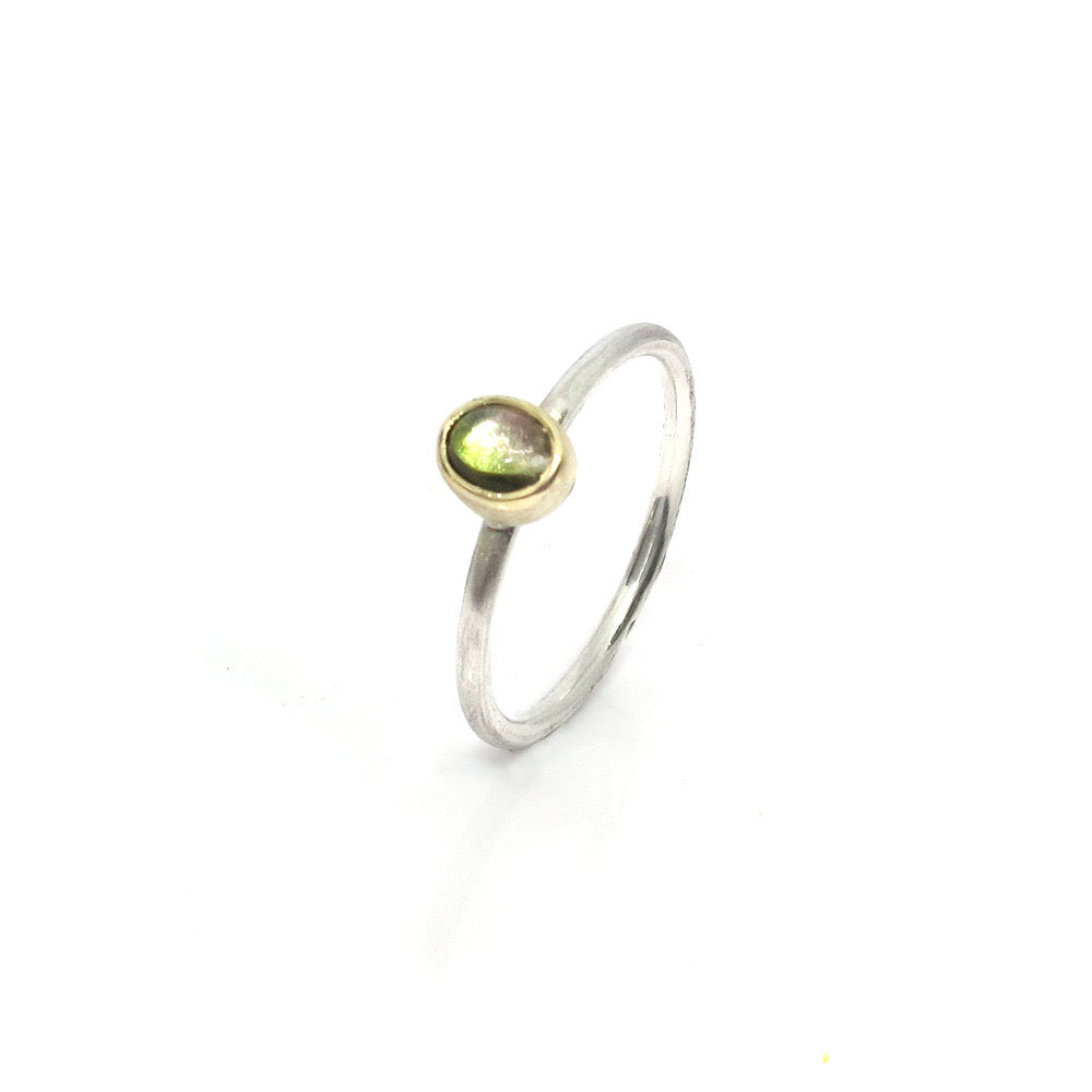 Stapelring aus Silber und Gold mit einem hellgrünen Turmalin. Ein wunderschöner Ring für sich allein, aber auch schön in Kombination mit anderen Stapelringen !