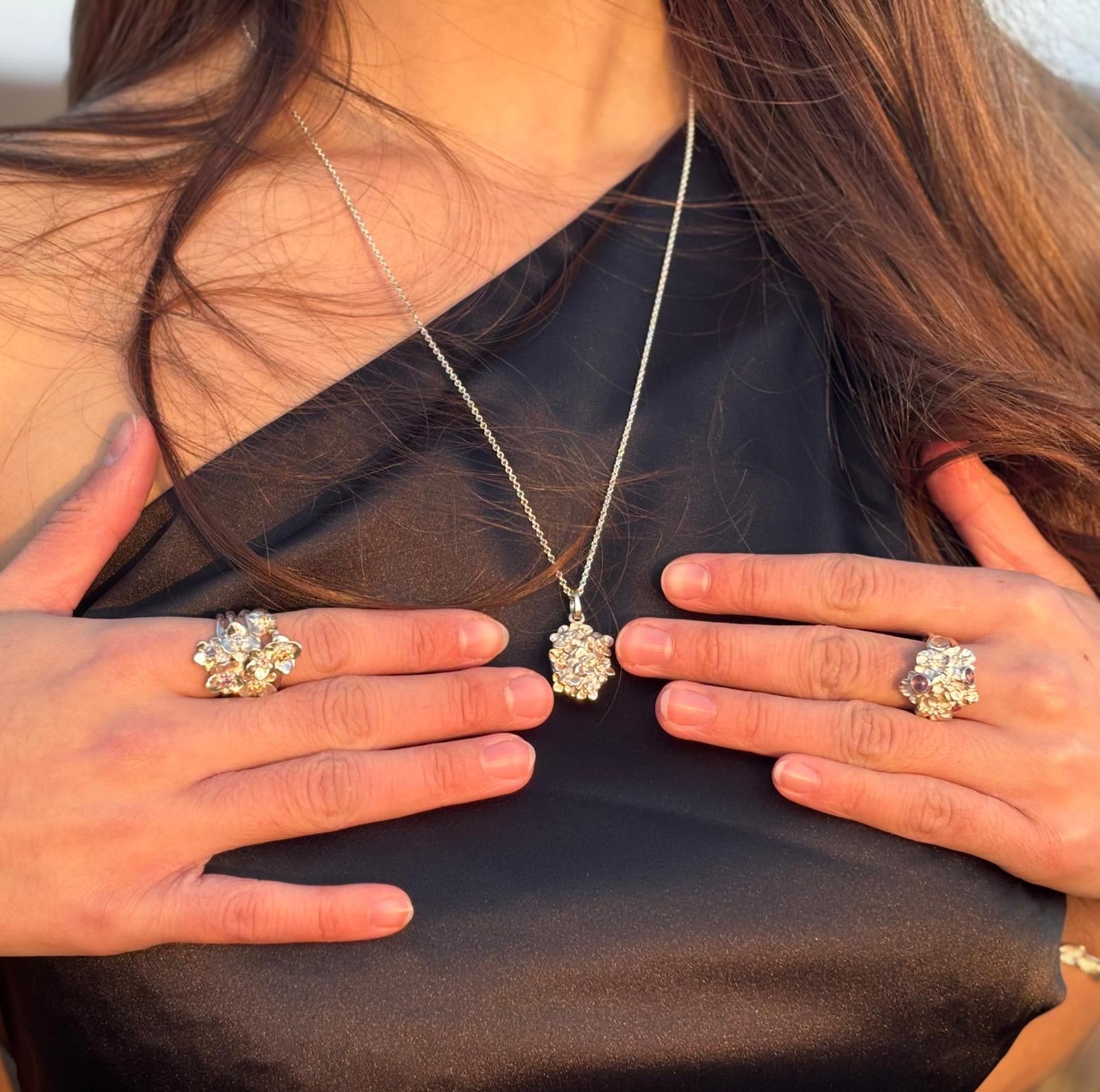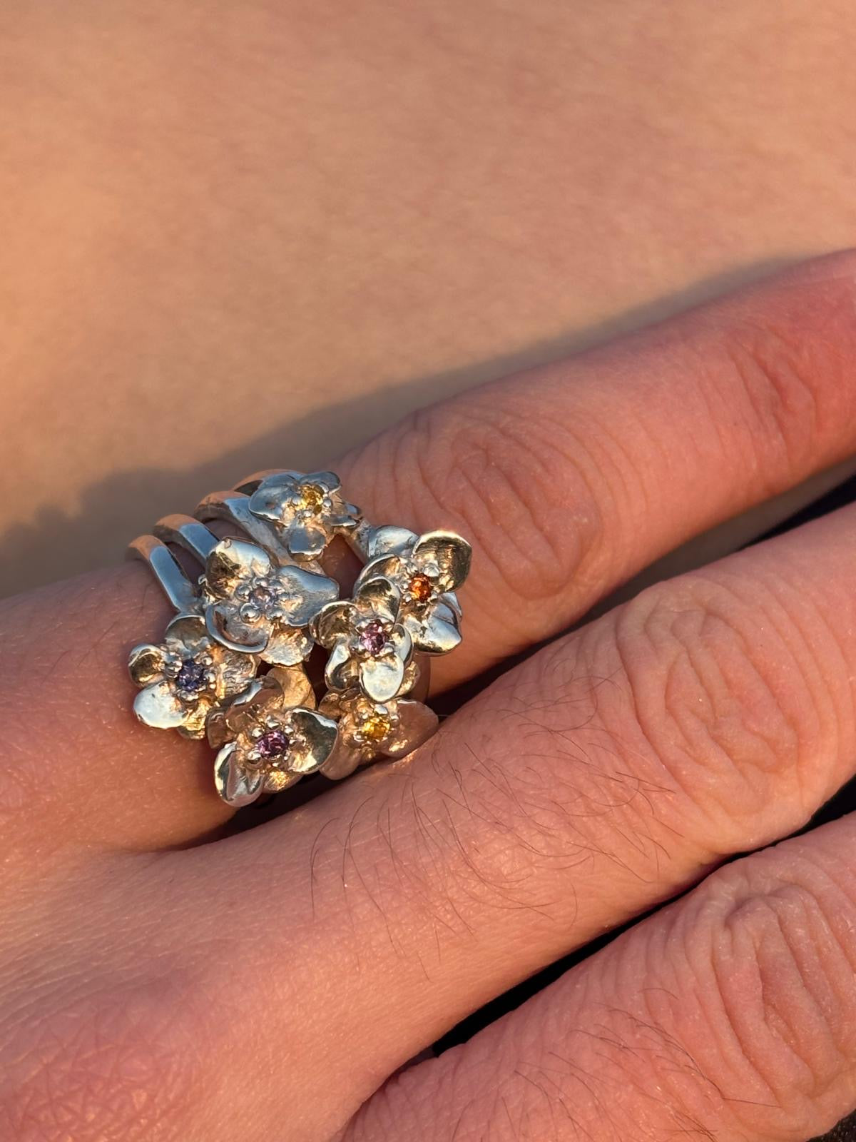 Dieser Ring stiehlt mit seinen sieben Blüten, jede mit einem andersfarbigen Turmalin, wirklich die Show. Ein echter Hingucker an Ihrer Hand!