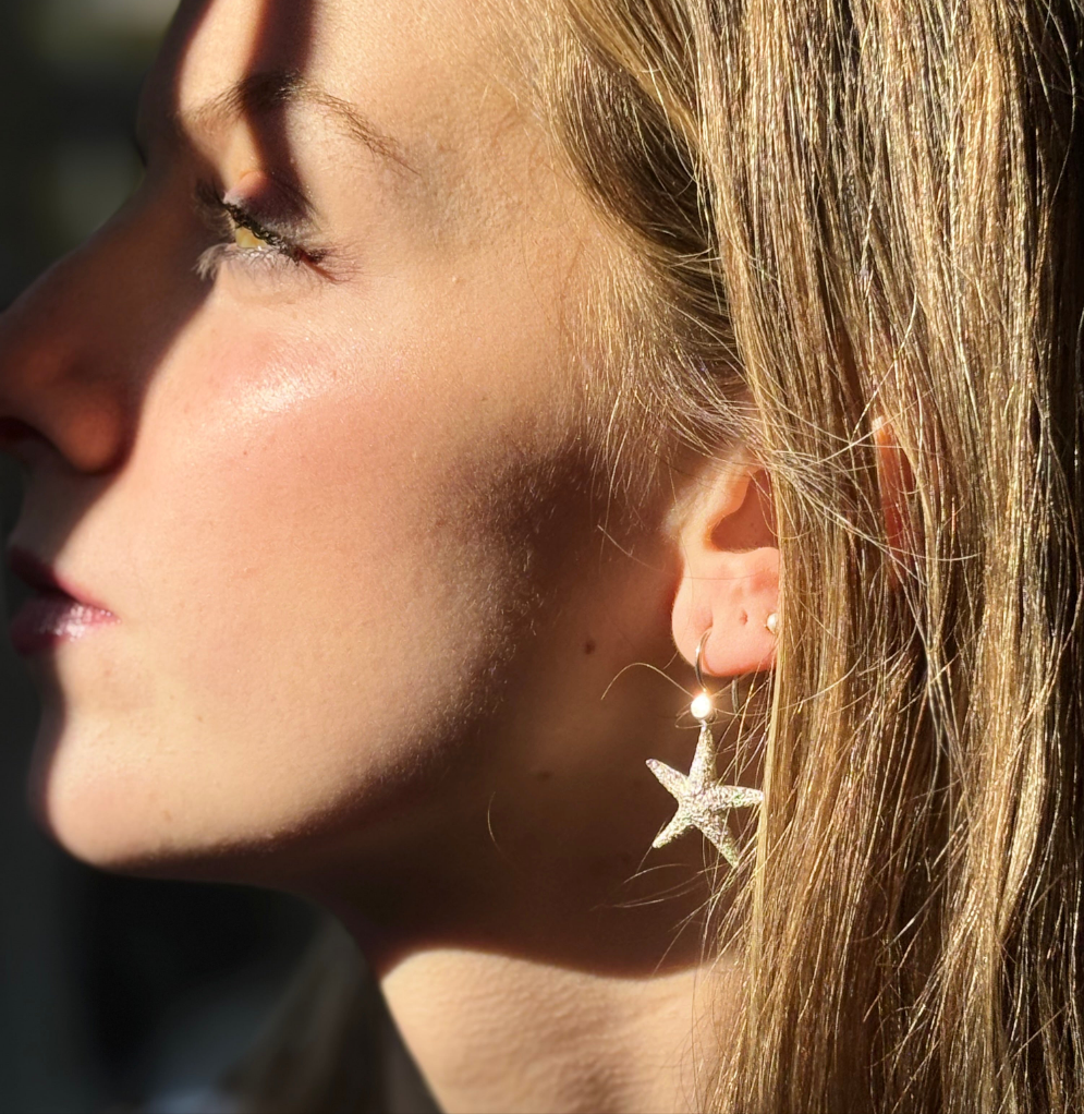 Diese Ohrringe sind ein persönlicher Favorit. Hergestellt aus silbernen Seesternen mit einer wunderschönen Textur. Die Seesterne sind ca. 2 cm groß.