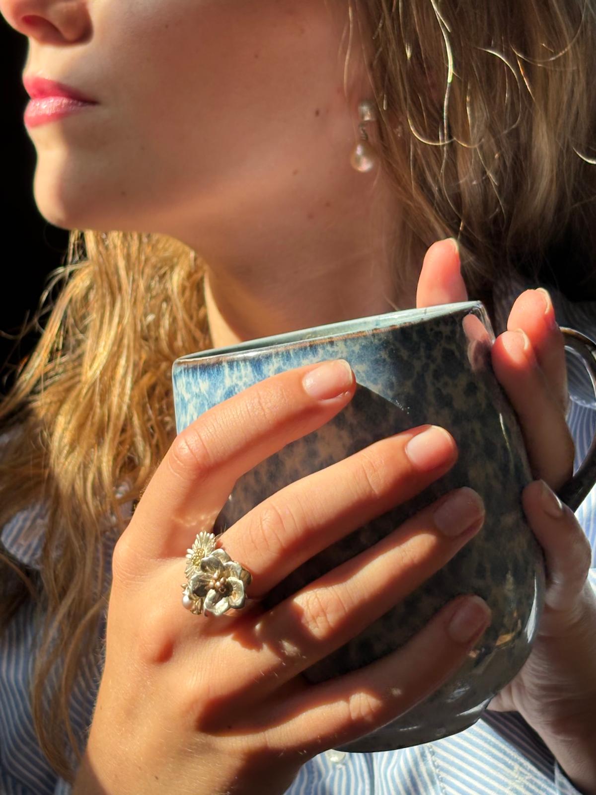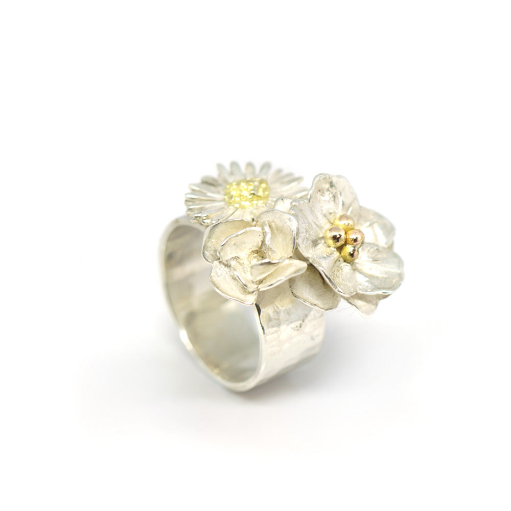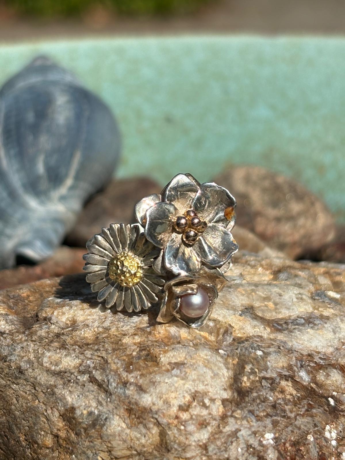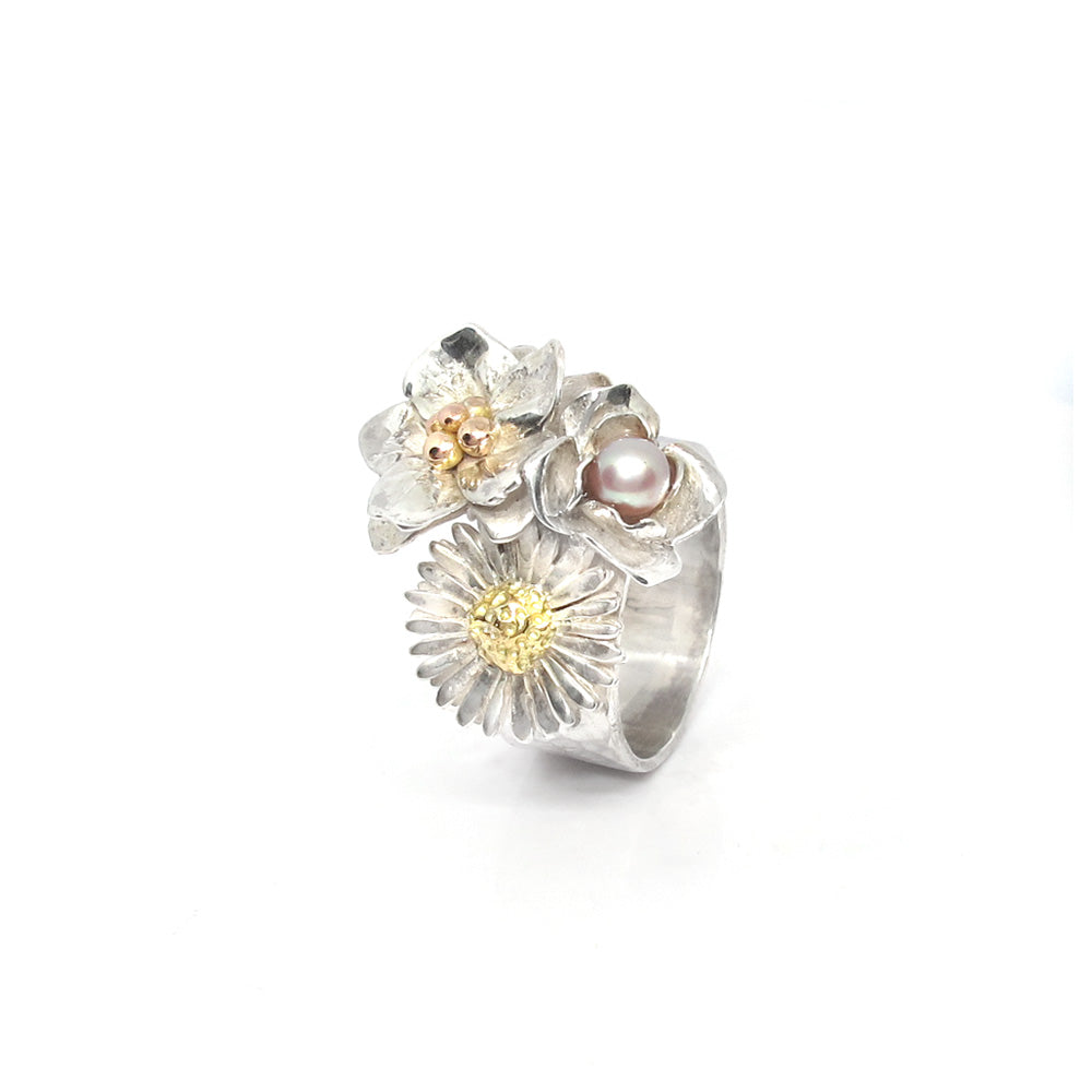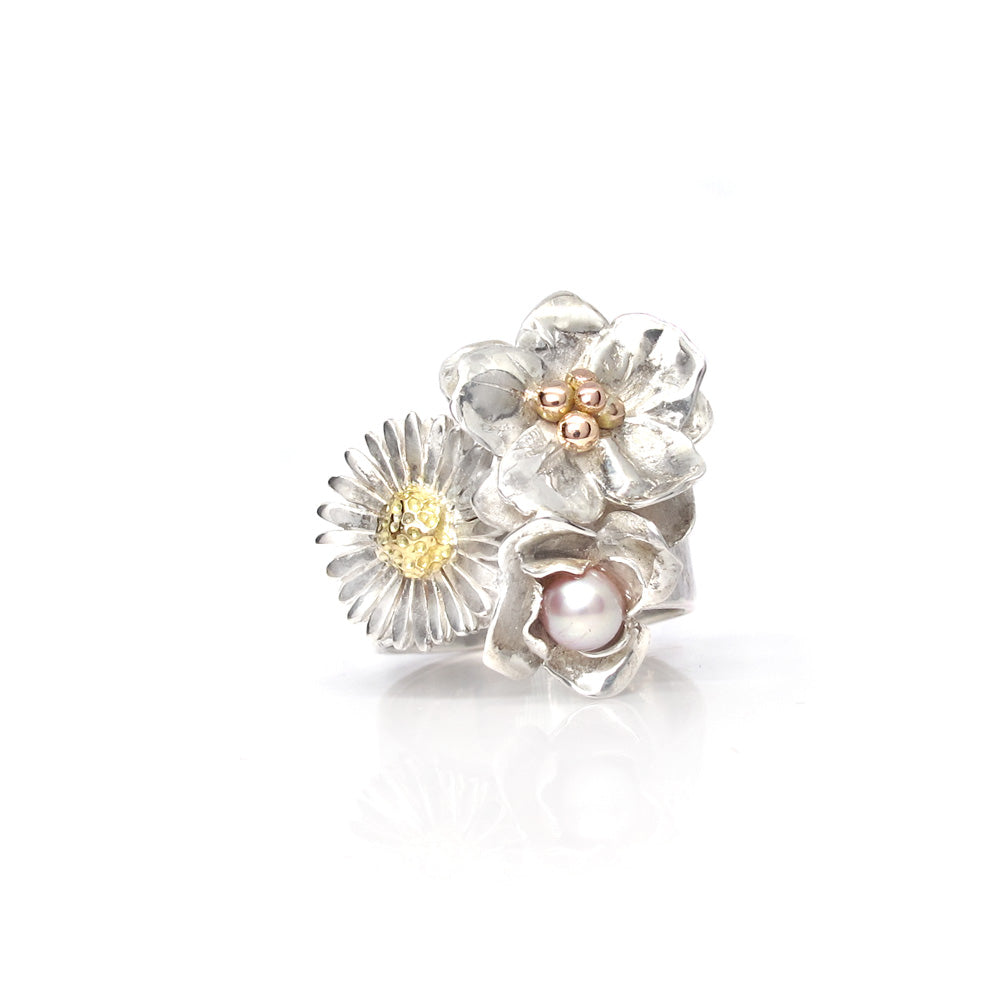 A daisy, poppy and wild rose of silver and gold. With a freshwater pearl.