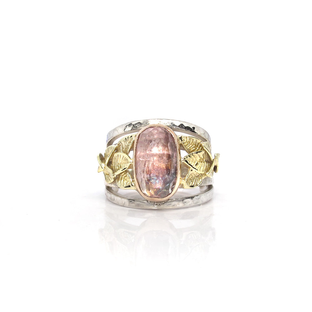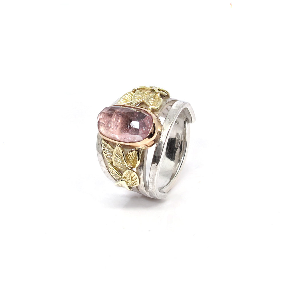 Lovely large ring made of silver, decorated with gold leaves and a large setting of red gold in the middle with a pink tourmaline in it.