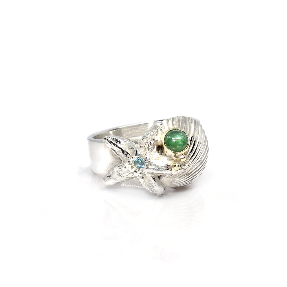 Beautiful silver ring with starfish and shell, decorated with topaz, tourmaline and gold.