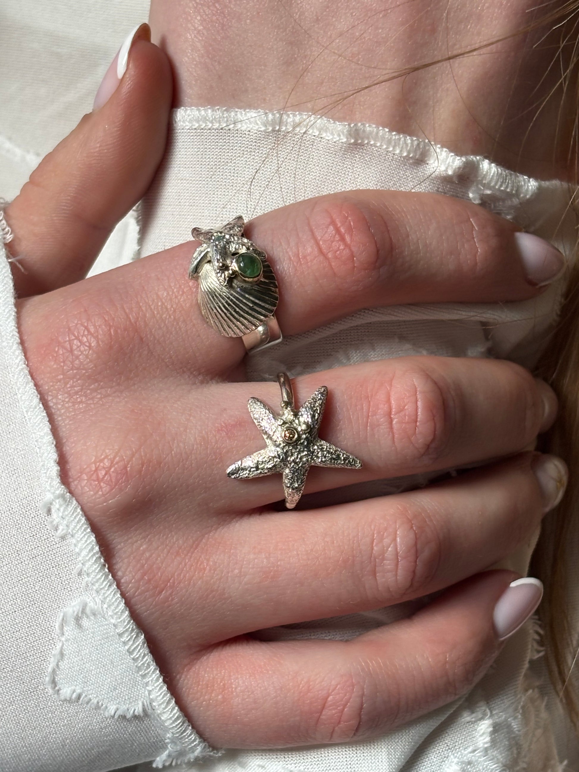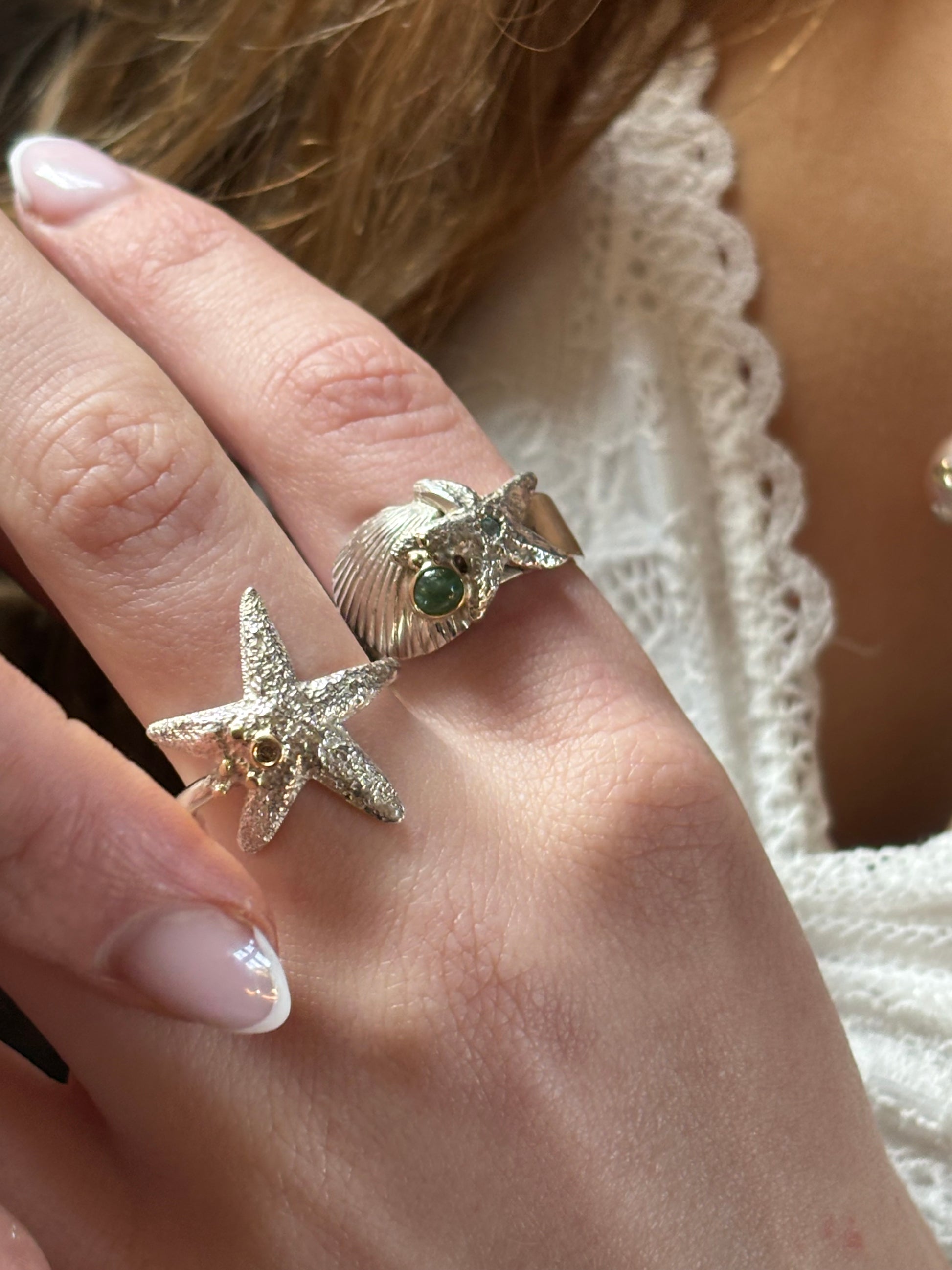 Richly decorated ring with silver shell and starfish.
