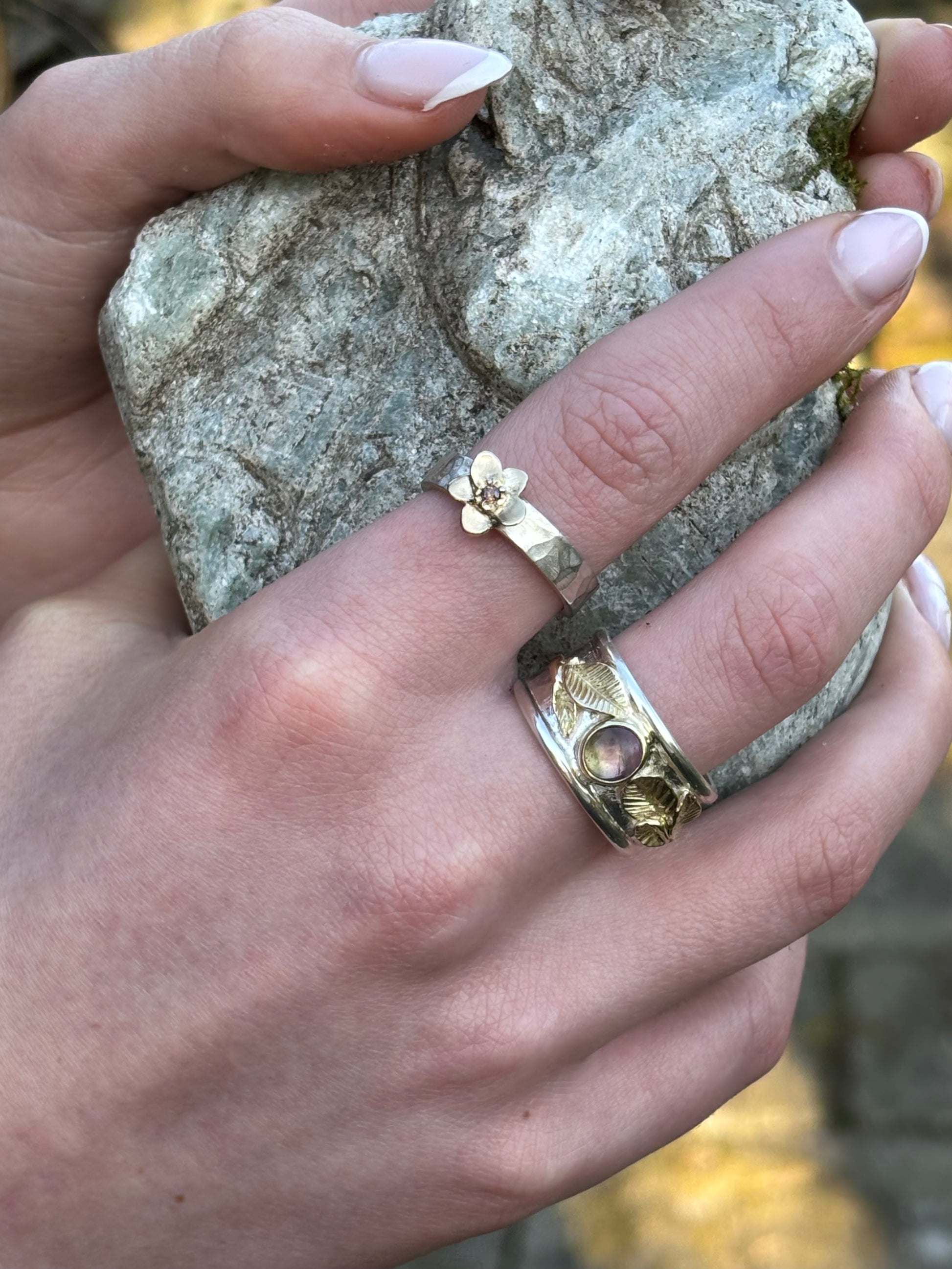 Delicate gold flower with pink tourmaline, on a sleekly designed ring of hammered silver.