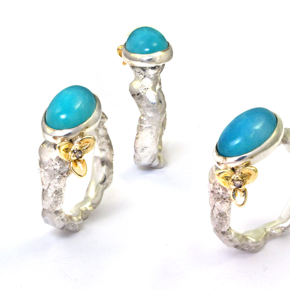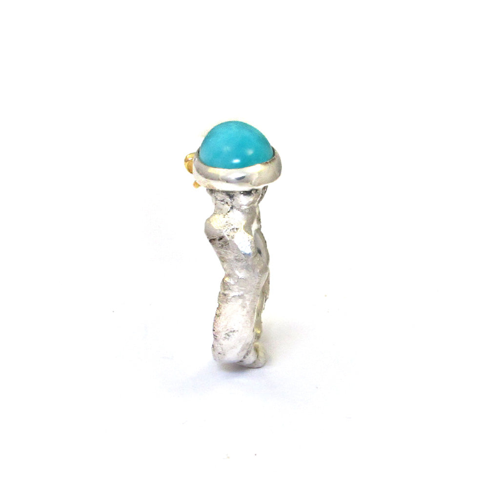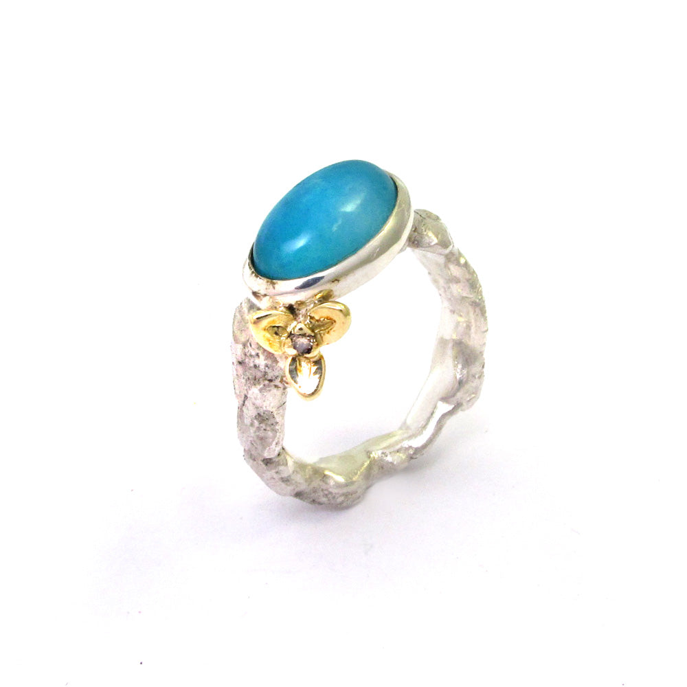 Beautiful boho ring made of silver with a golden flower with a large oval aquamarine on top.