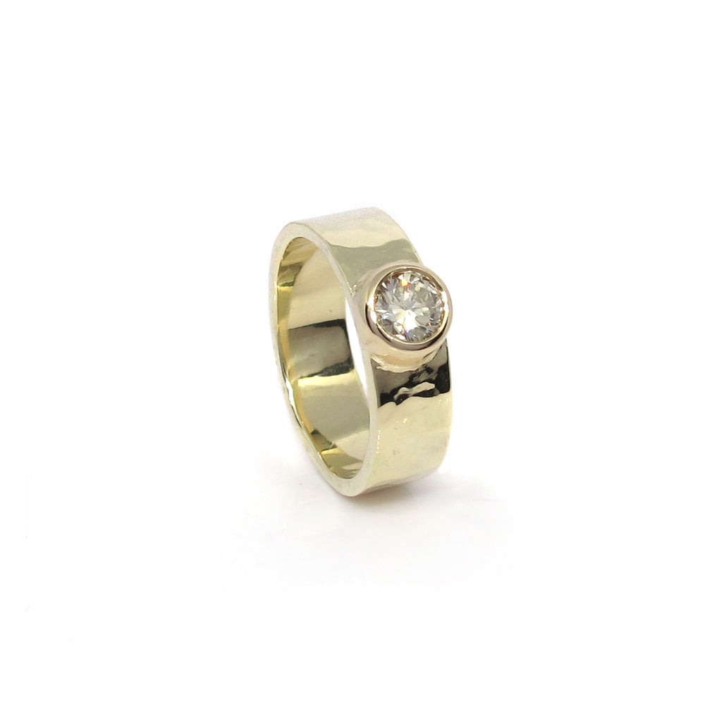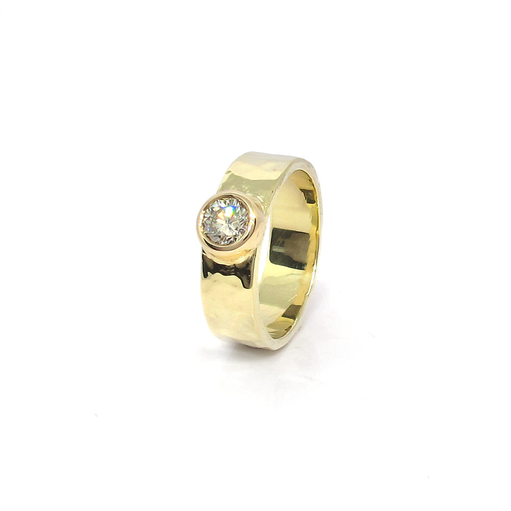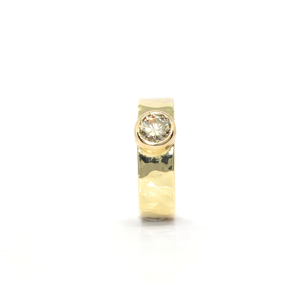Robuuste gouden ring met hamerslag en diamant.