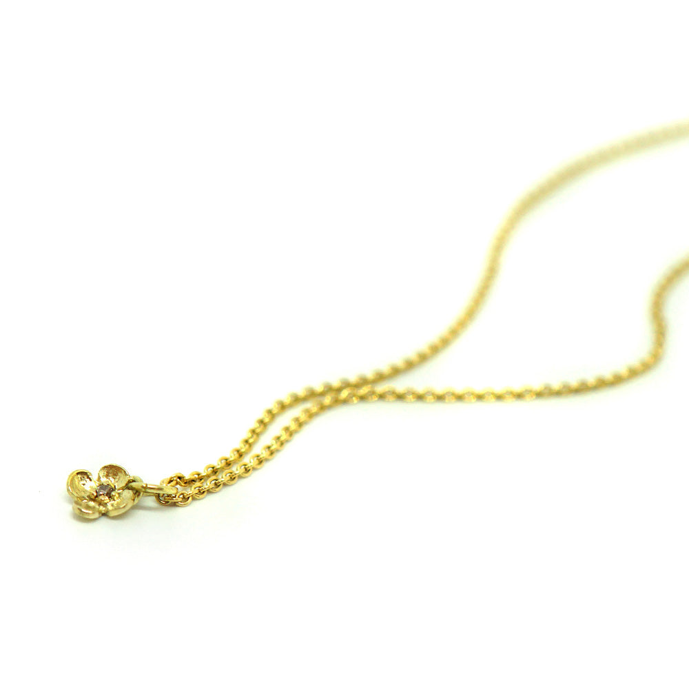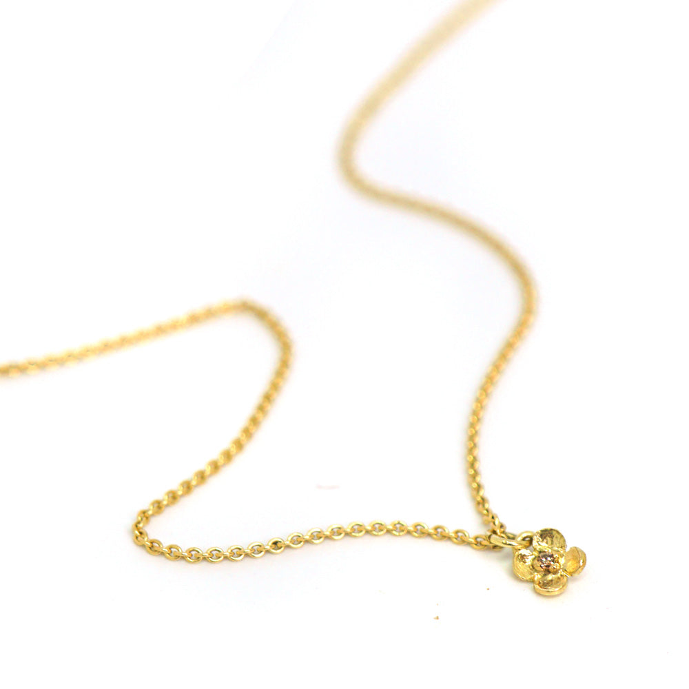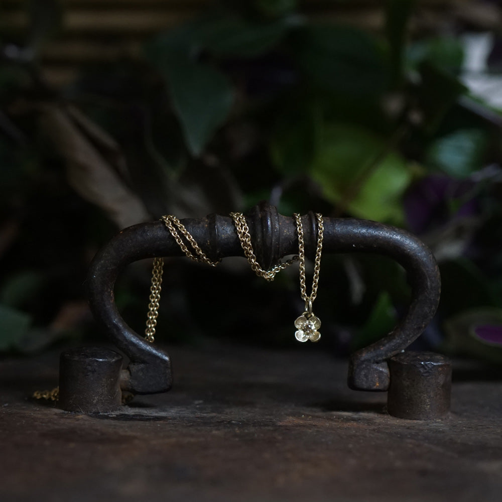 Subtiele en elegante ketting met gouden hanger in de vorm van een bloemetjes met in zijn hart een diamantje.