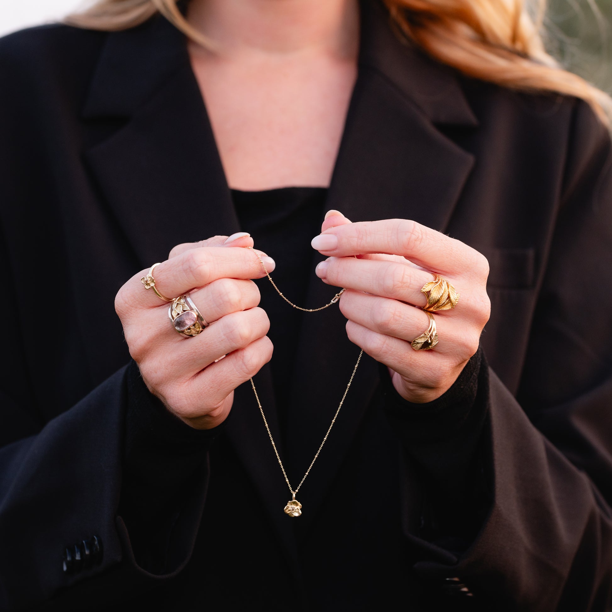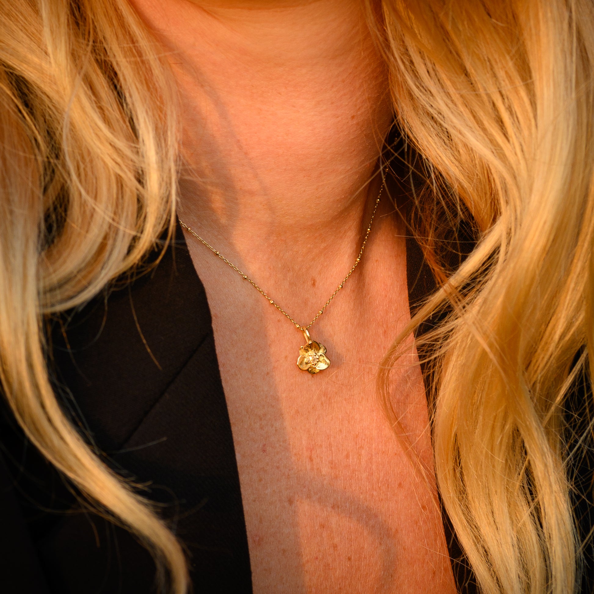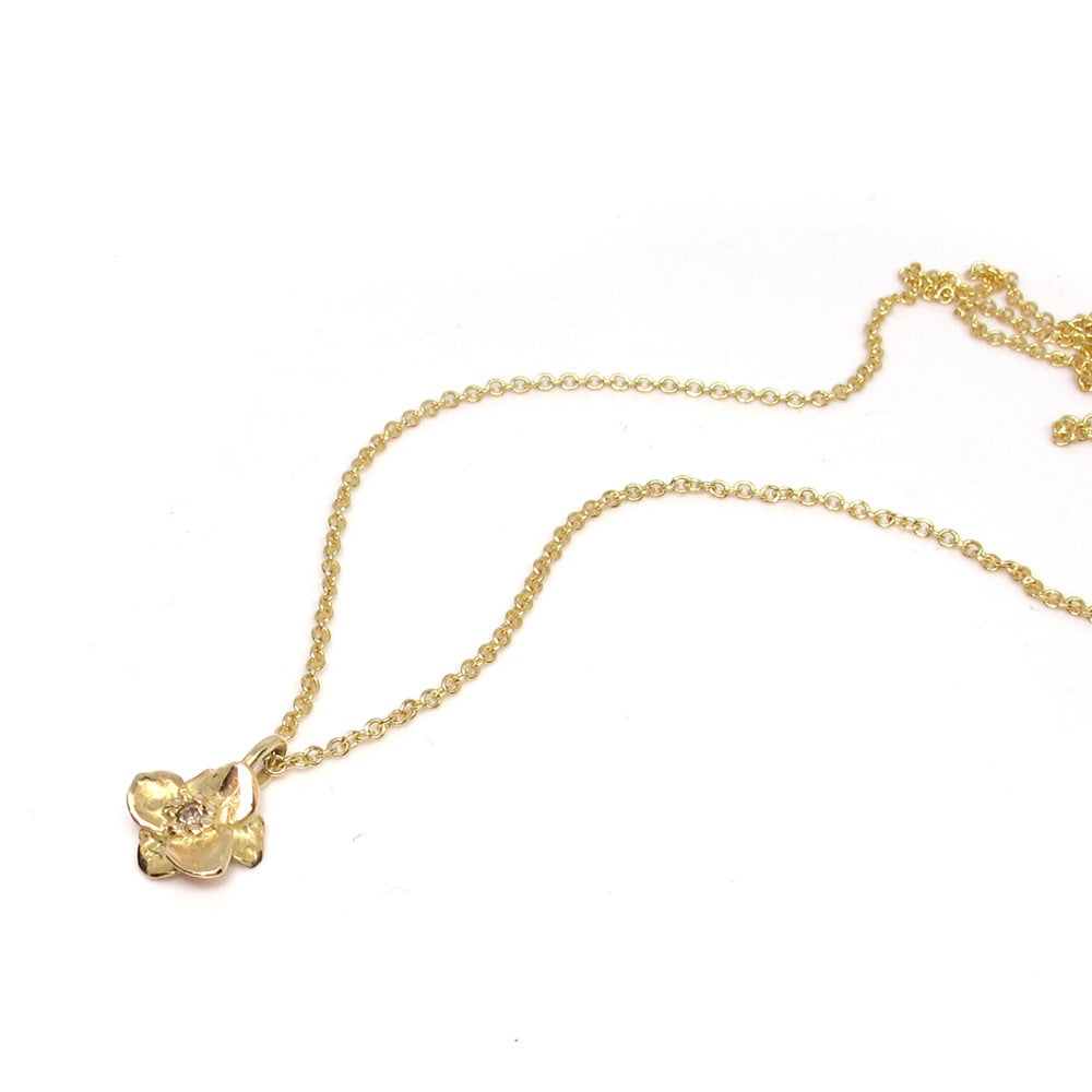 Lief hangertje met bloem en diamant aan een gouden collier. In deze lijn zijn ook een bijpassende ring en oorknopjes verkrijgbaar voor een complete set!