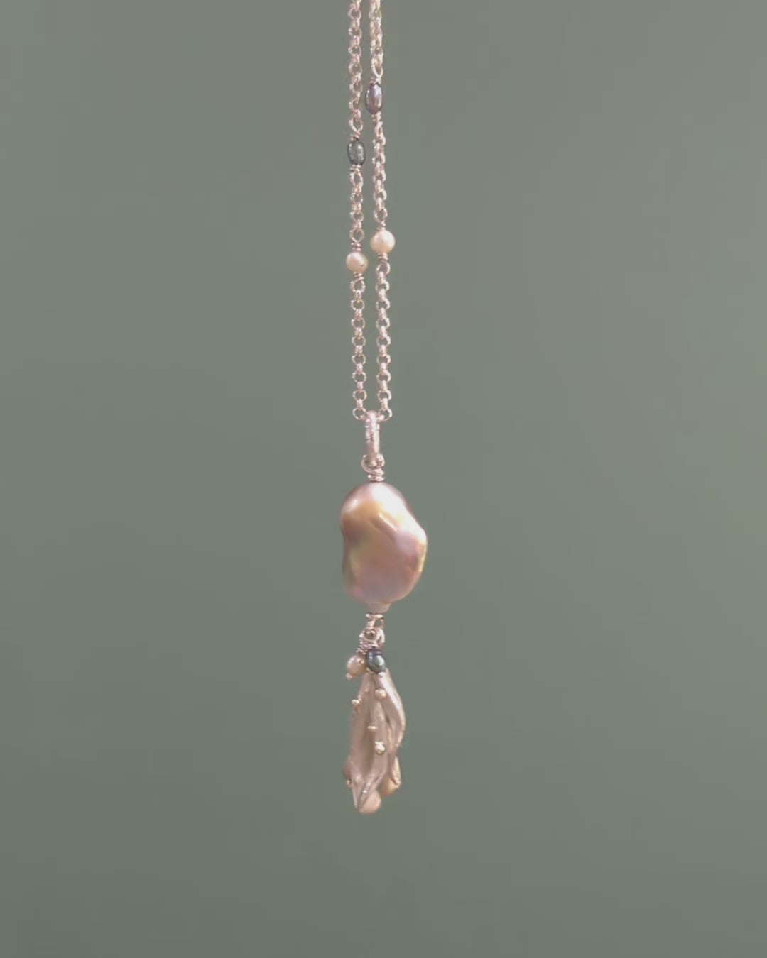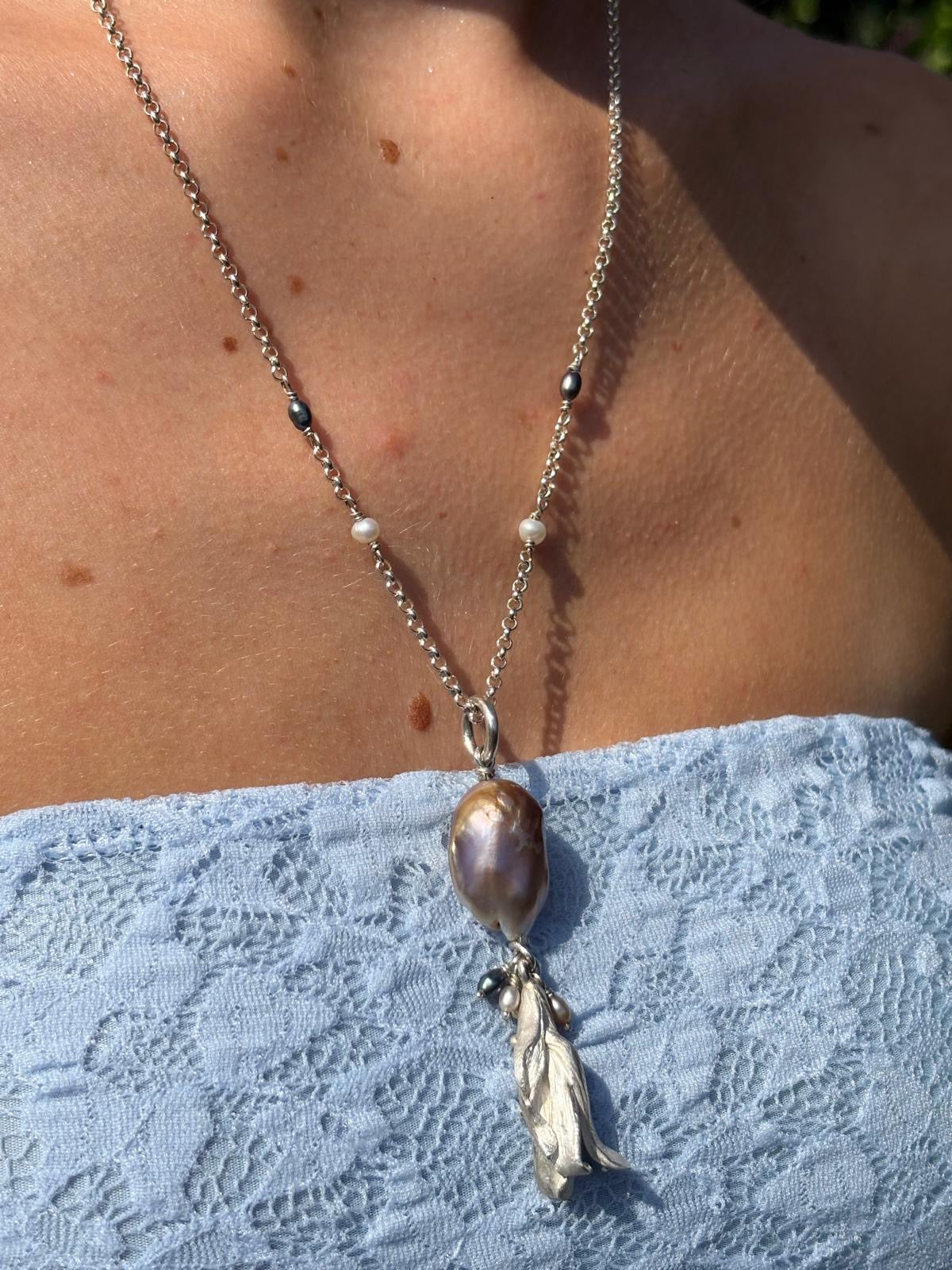 Een prachtige barok zoetwaterparel is de basis van deze 'jellyfish'. Gemaakt van zilver en 14 karaat geelgouden bolletjes.