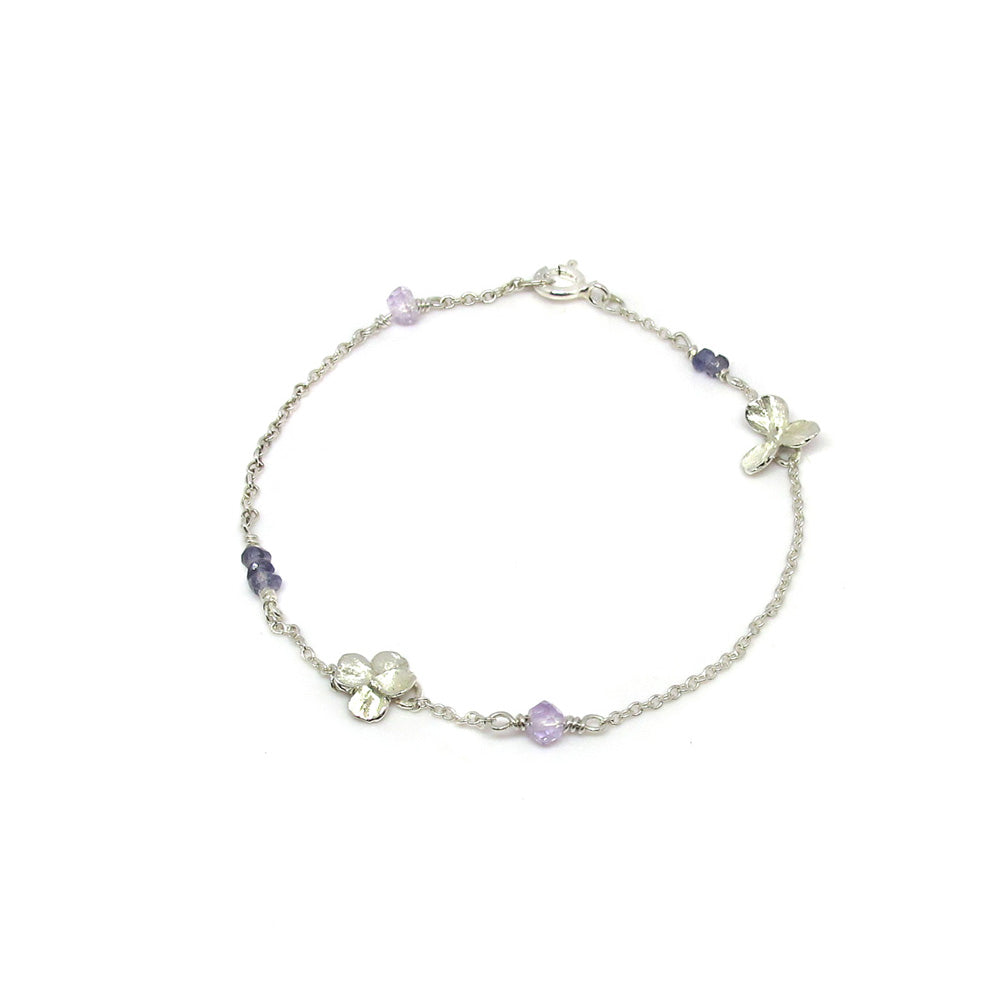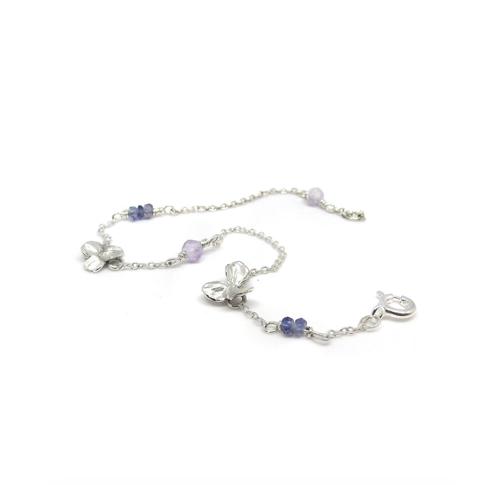 Prachtige bohemien armband van zilver met bloemetjes en edelstenen versierd.