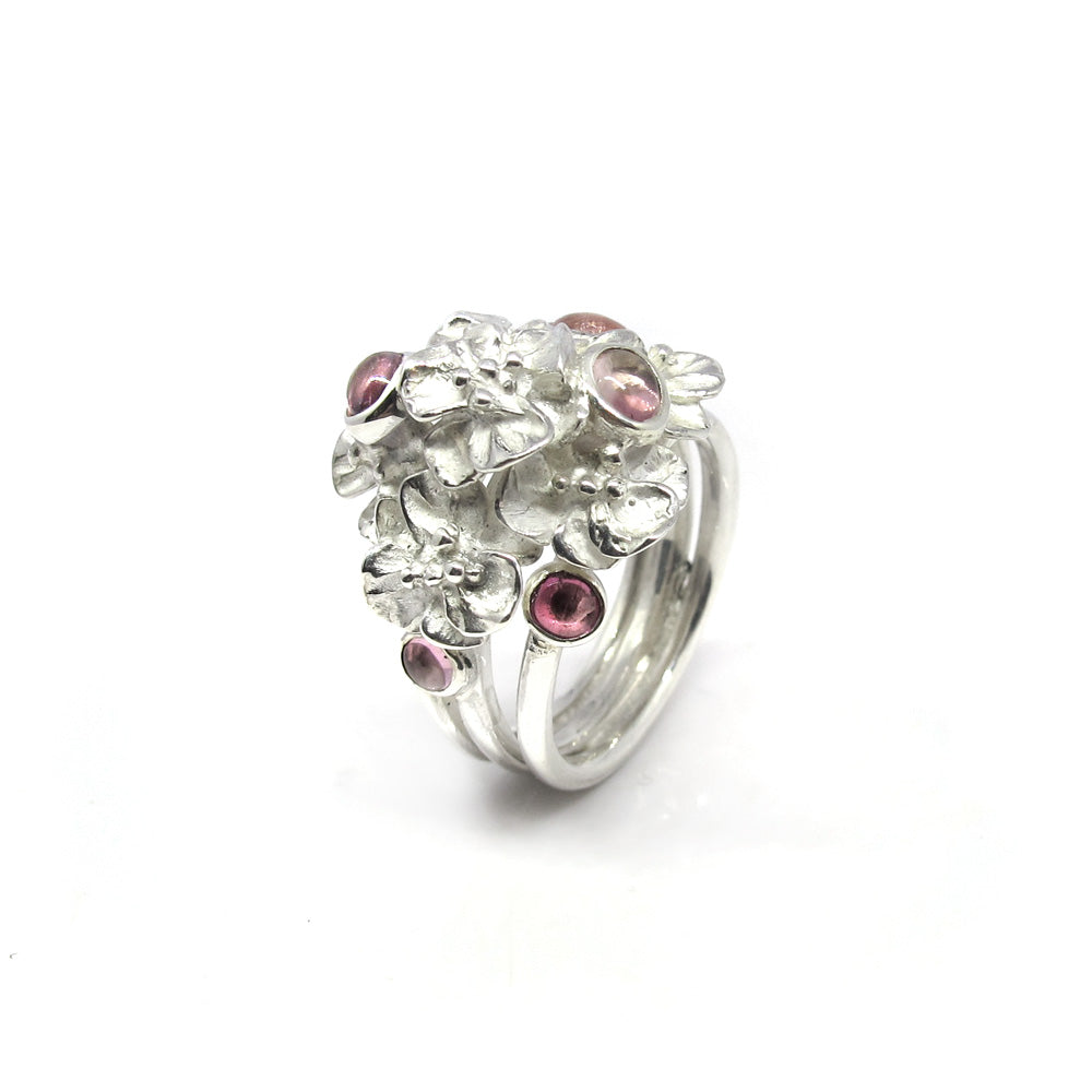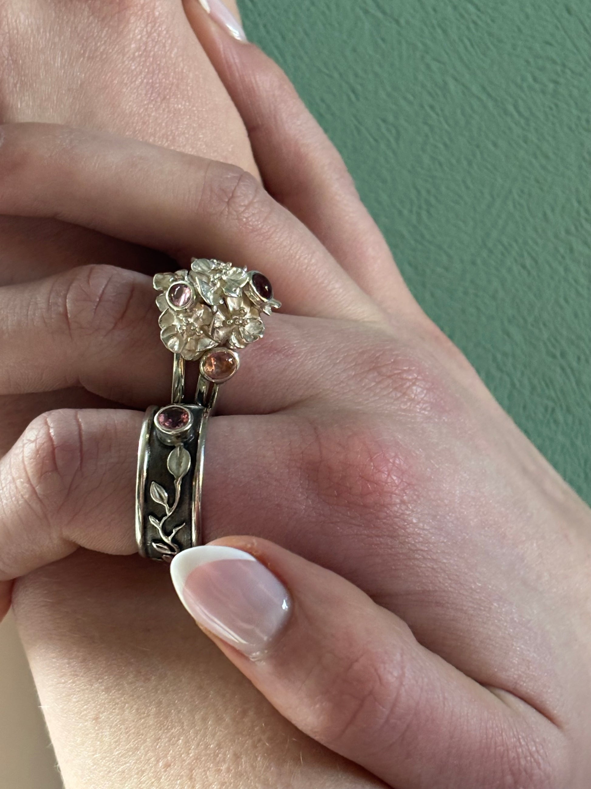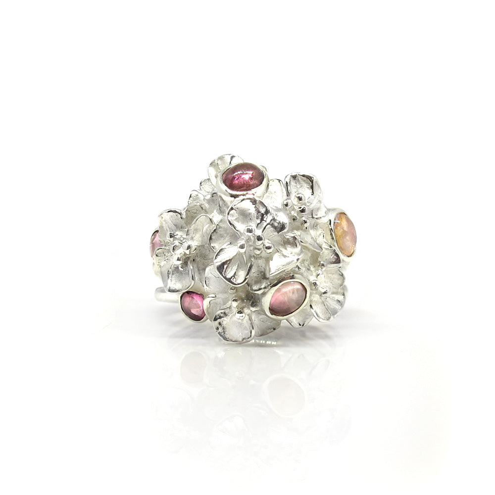 Een heerlijk grote opvallende ring, opgebouwd uit zilveren bloemen en met roze toermalijntjes versierd.