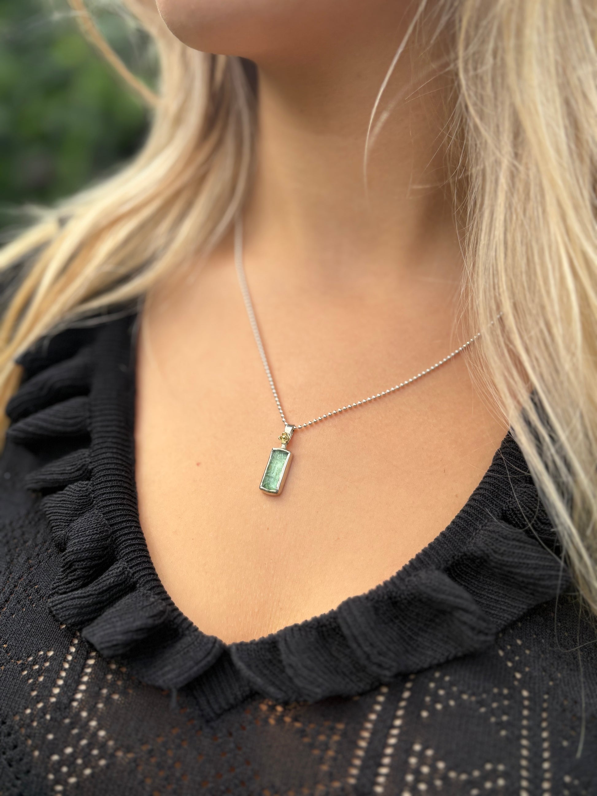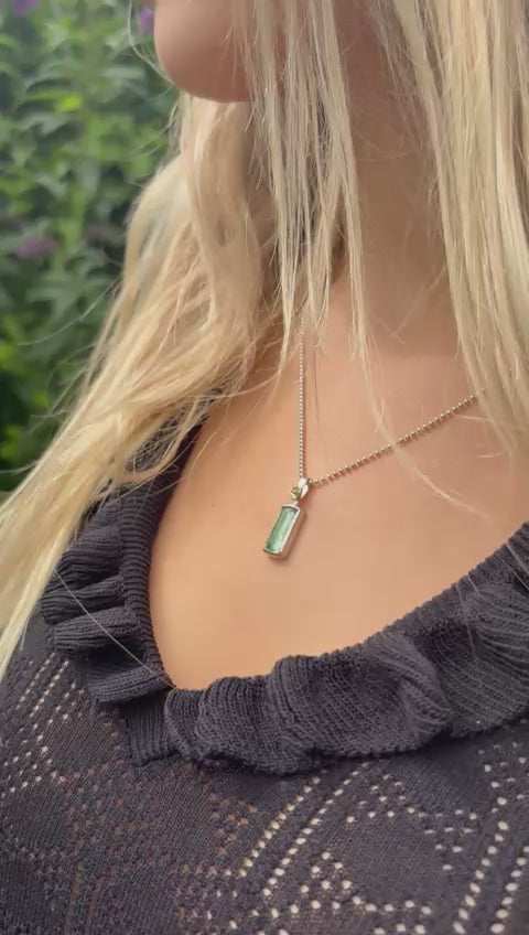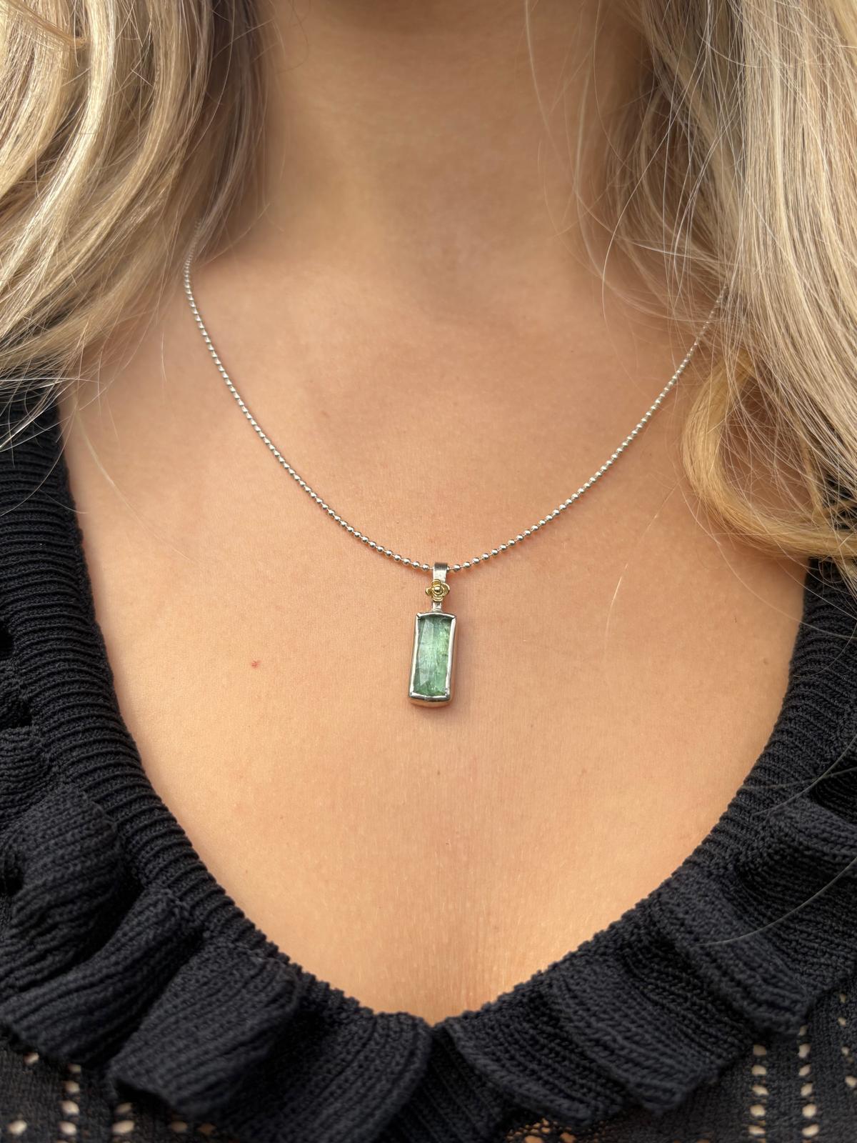 Prachtige unieke hanger met zeegroene toermalijn. Deze toermalijn heeft een prachtige tekening en is in elk licht weer net even anders. Elk sieraad is daarom uniek. De toermalijn is gevat in een rechthoekig kastje met erboven een gouden bloemetje. Erbij een bolletjescollier van 50 cm lang. Als u liever een ander collier erbij wilt is dat natuurlijk mogelijk. Neemt u in dat geval contact met ons op.