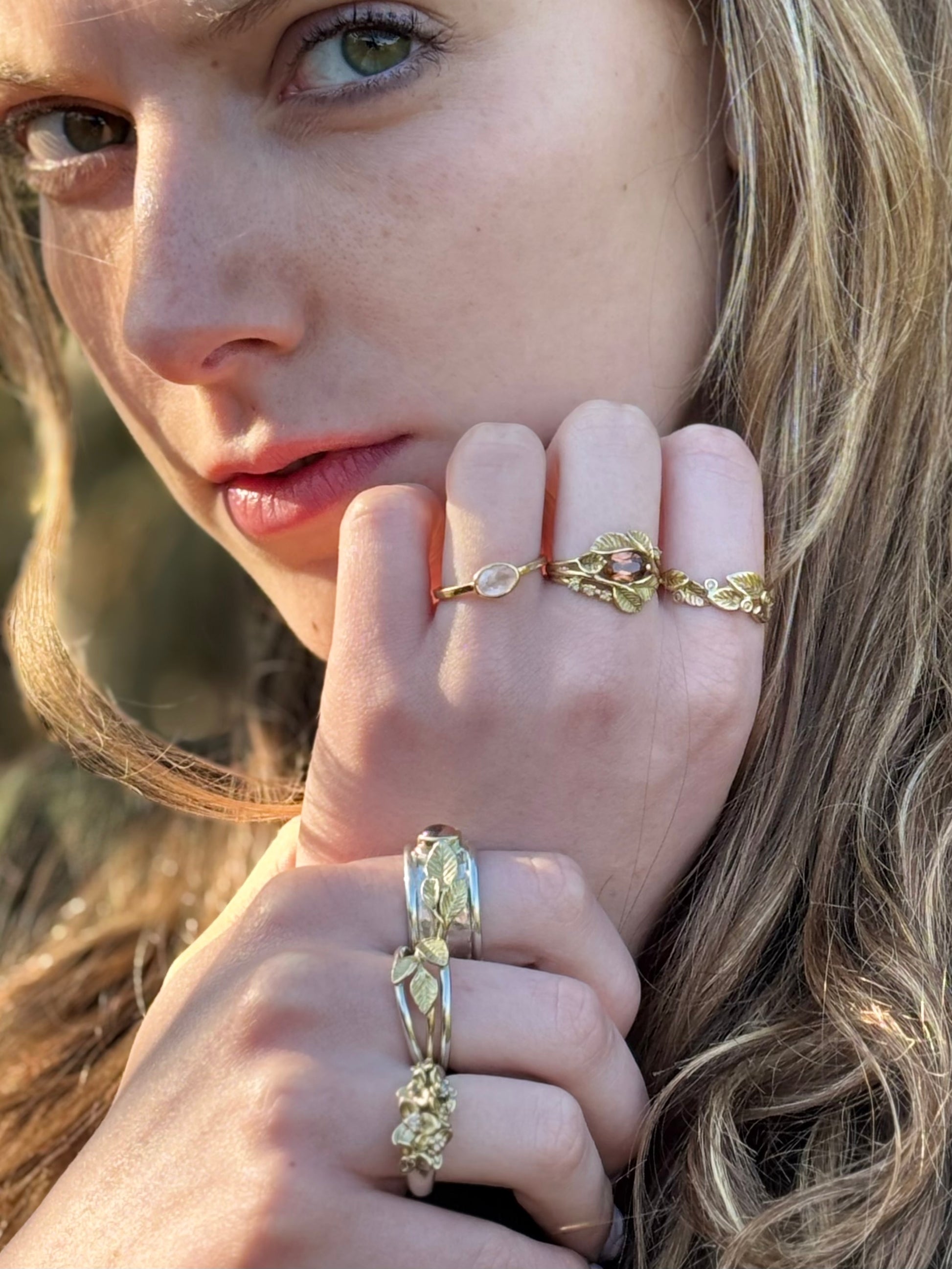 Dubbele zilveren ring met elegante blaadjes van goud.