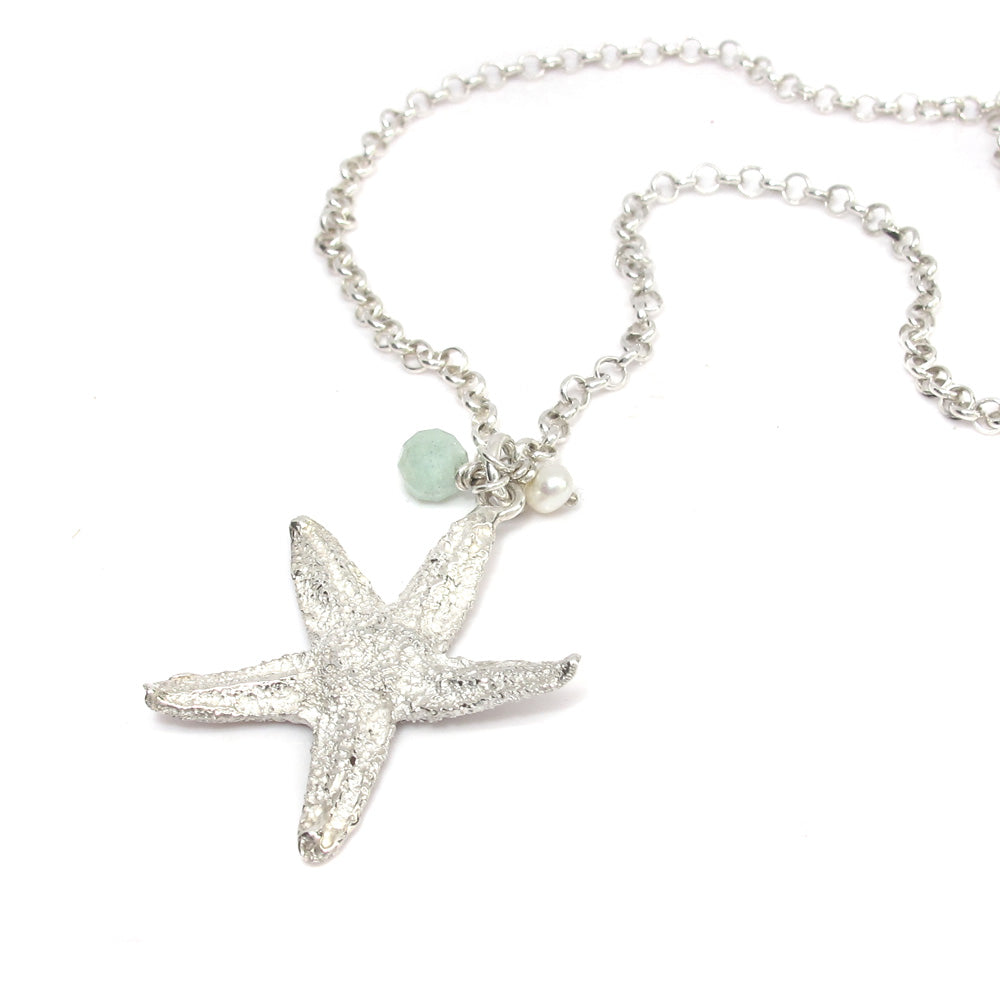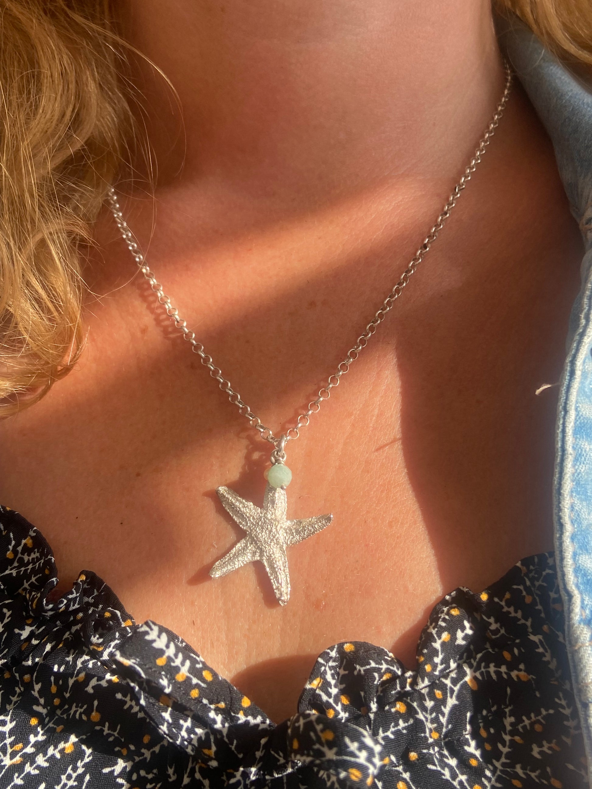 De grote zomerhit, deze prachtige zeester van zilver. Met een doorsnede van 3 cm is het een echte eyecatcher. Eventueel kan de zeester versierd worden met een edelsteen of parel naar keuze. Neem voor de mogelijkheden contact met ons op. In dit voorbeeld ziet u de zeester met een amazoniet.